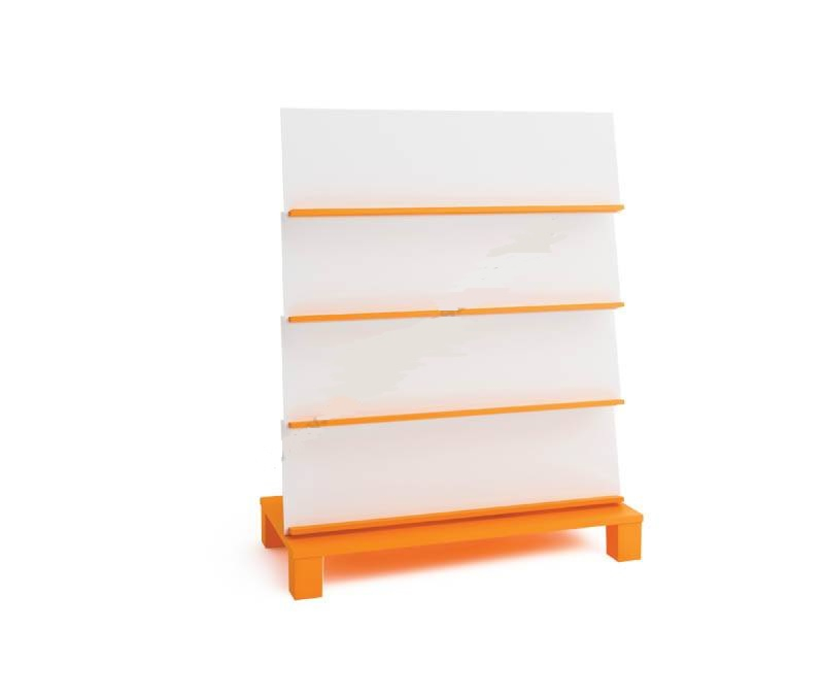 Двосторонній відкритий стелаж призначений для демонстрації та зберігання книг, іграшок та ігор. Вони ідеально підходять для шкільних бібліотек або тематичних куточків дошкільних закладів. Бічні сторони стелажа зроблені з ламінованого ДСП кольору берези, з’єднані косими поличками або традиційними полицями, залежно від моделі.