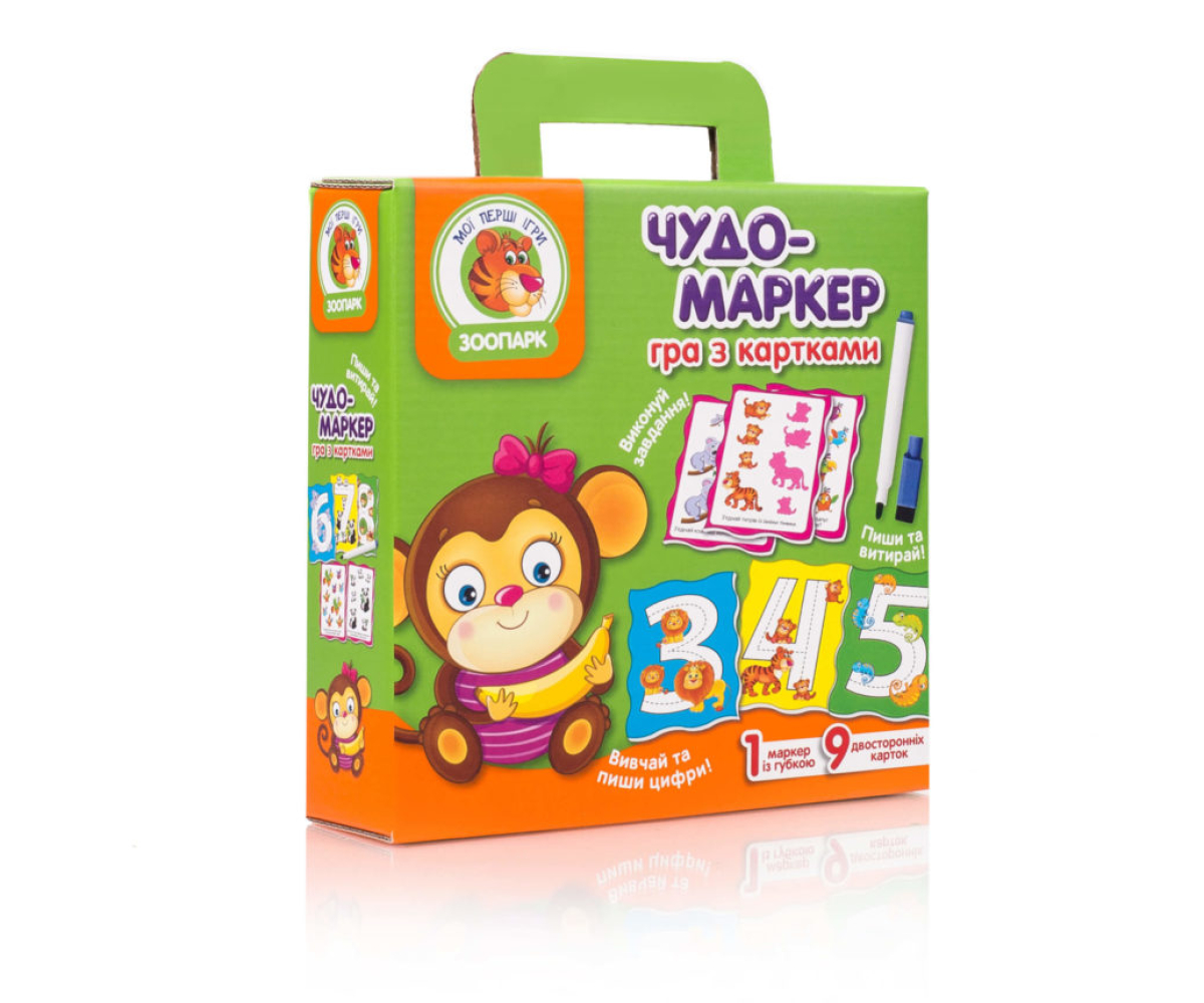 Цікава та захоплююча гра, складається з двохсторонніх карток, маркера з гумкою та інструкції. Малюк зможе навчитись писати цифри та рахувати. Особливістю є те, що завдання можна виконувати багато разів.