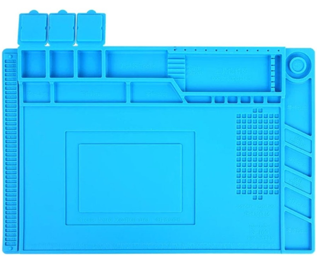 М'який нетоксичний силікон не ковзає, витримує високу температуру до 500℃ і надійно захищає поверхню робочого столу. Різноманітні відсіки, магнітні та звичайні, дозволяють завжди тримати в порядку робоче місце. Існують спеціальні отвори під викрутки, місце для плати телефону, відсіки з кришками, пронумеровані комірки для болтів, розмірна лінійка.