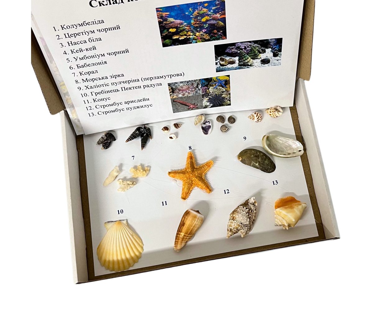 Використовується в кабінетах біології та географії загальноосвітнього навчального закладу під час проведення демонстраційних дослідів. Колекція містить біологічні об’єкти, що можна зустріти на морському дні: корали, морські зірки, раковини молюсків, краби. Дозволяє демонструвати різноманіття організмів, що мешкають на дні морів.