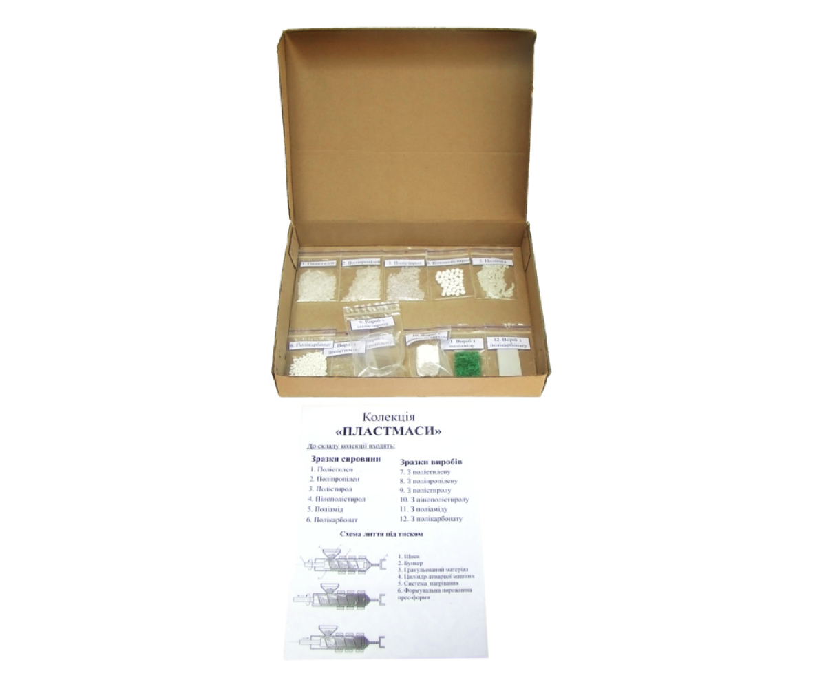 Використовується колекція «Пластмаси» (роздаткова) в кабінеті хімії загальноосвітнього навчального закладу при вивченні курсу органічної хімії, тема «Пластмаси». Колекція застосовується для ознайомлення учнів з зовнішнім виглядом і властивостями високомолекулярних речовин і матеріалів, що з них виробляються.