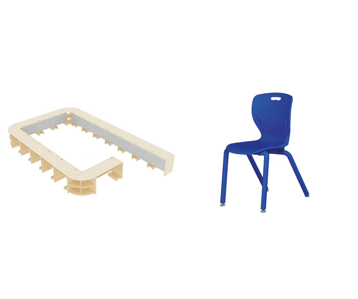 15 x робочих місці (столів) для учня. Розміри: 83 x 54,5 x 76,5, висота верху: 76,5 см.