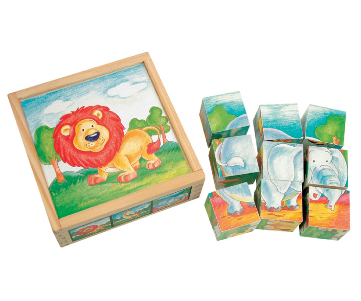 З 9 кубиків, які входять в набір можна скласти 6 картинок із зображеннями диких тварин: мавпа, тигр, слон, лев, ведмідь, жираф. Гра розвиває координацію рухів, логічне мислення, уяву, активізує розумову діяльність.