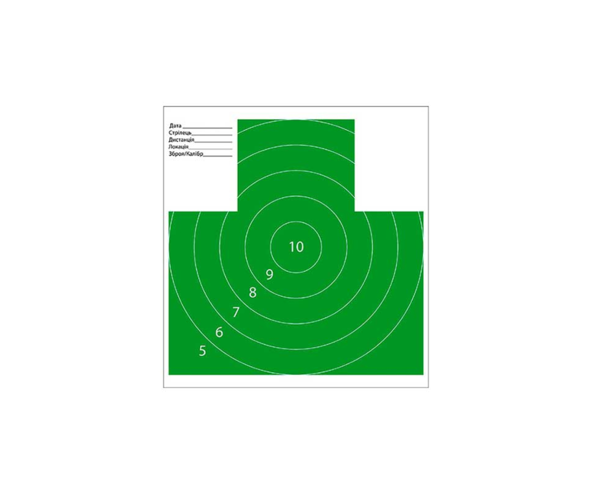 Мішень грудна фігура з колами №4, стандартного зразка, призначена для виконання штатних вправ: стрільба з автомата чергами з дистанції до 250 метрів, стрільби з автомата одиночними, стрільби з карабіна, ручного кулемета на дистанції 100 метрів, з пістолета - на дистанції 25 метрів . Мішень являє собою аркуш цупкого паперу з кольоровим силует на білому тлі, габаритними розмірами 50х50 см, з білими колами. Діаметр десятки - 100 мм, відстань між сусідніми колами 50 мм. Зазорів між зеленою фігурою і краями папери не передбачено, але вони допустимі, в зв'язку з чим зброю пристрілюється по центру мішені. Кількість: 50 шт.