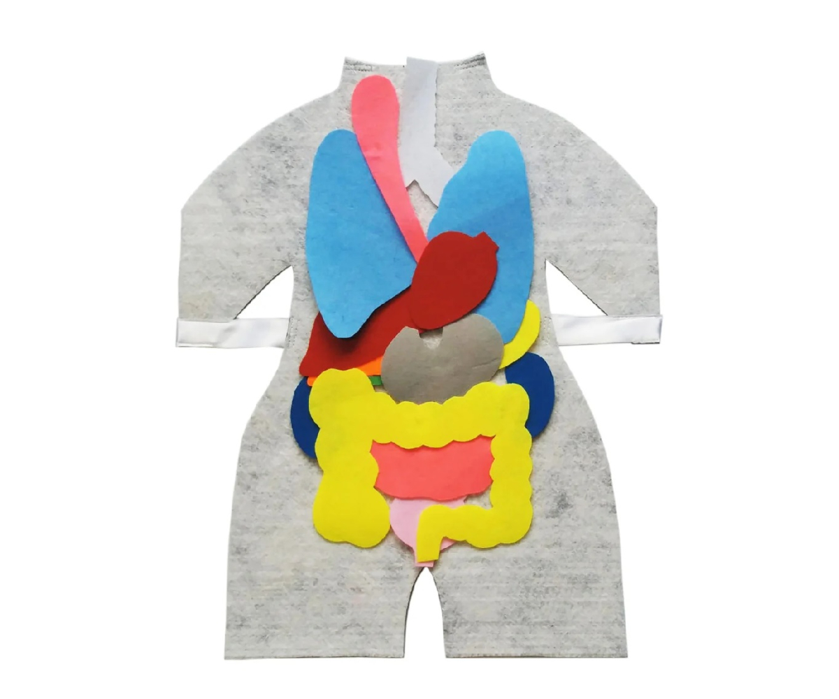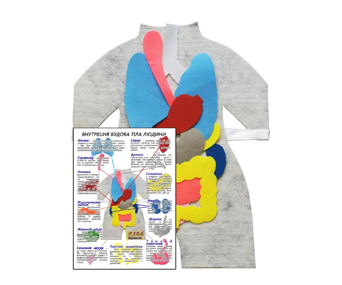 Усі органи на фартуху - основі виготовленні із кольорової цупкої тканини і мають кріплення для зручної перестановки на основі. Моделі- органи: легені, стравохід, печінка, підшлункова залоза, жовчний міхур, сечовий міхур, товстий та тонкий кишківник, шлунок, нирки, селезінка, бронхи та серце.