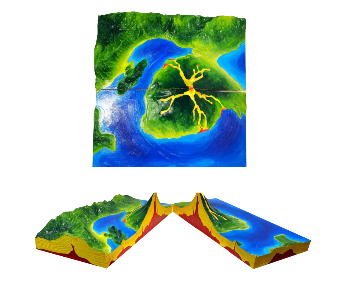 Модель розфарбована в природні кольори, зображує будова вулкана і різні аспекти вулканічної діяльності.