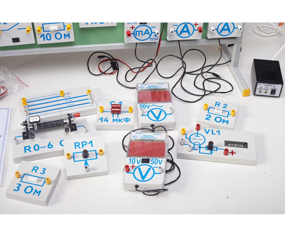 набір модулів (40 штук) електротехнічних елементів у пластмасових корпусах із зображеннями елементів та їх номіналів на зовнішній поверхні з магнітним кріпленням- 1 шт.;