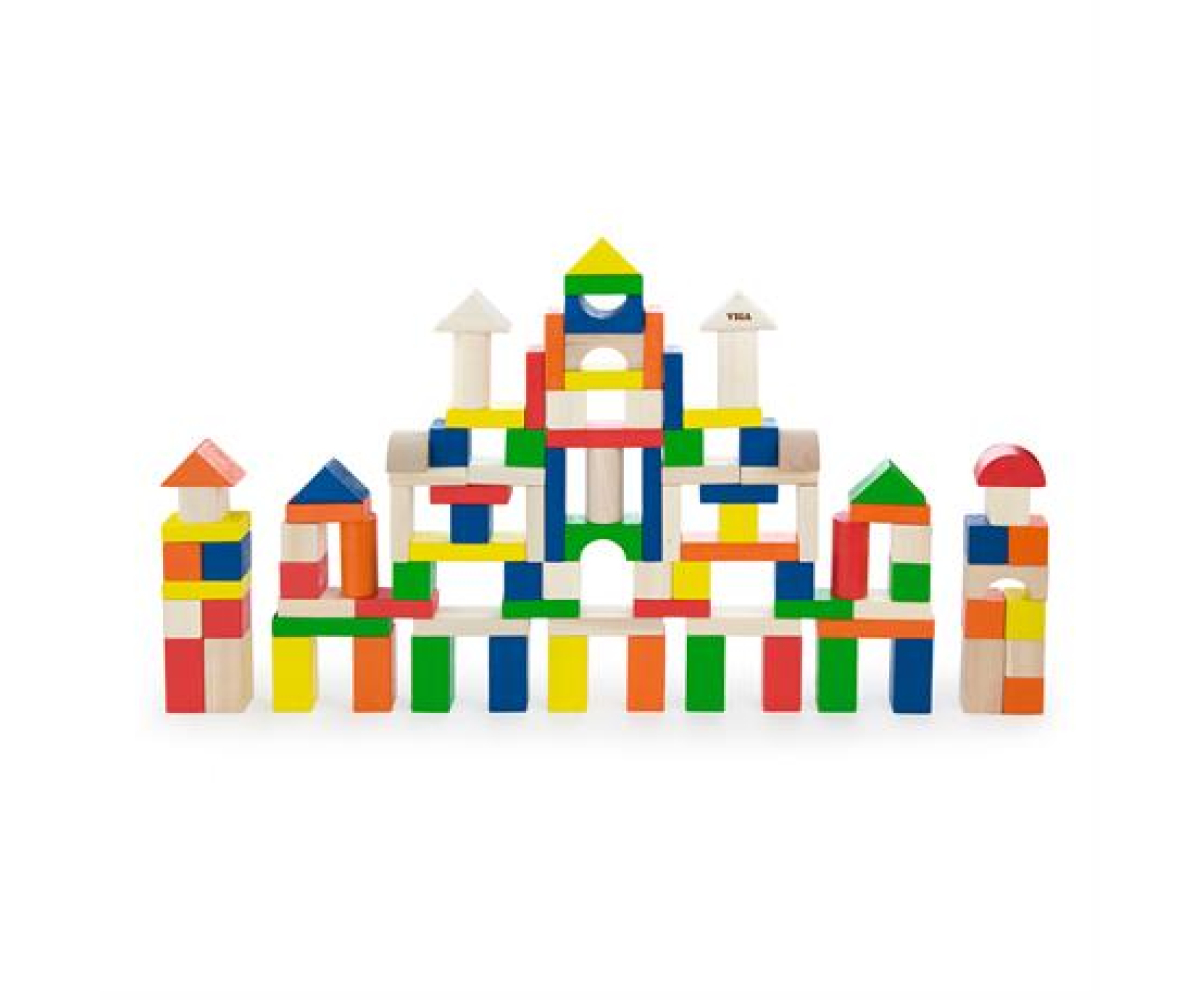 Кольорові блоки виготовлені із цільного дерева, відшліфовані до гладкості та вкриті нешкідливими фарбами. В наборі 100 дерев'яних блоків різних форм завтовшки 2,5 см для будівництва та корисних ігор.