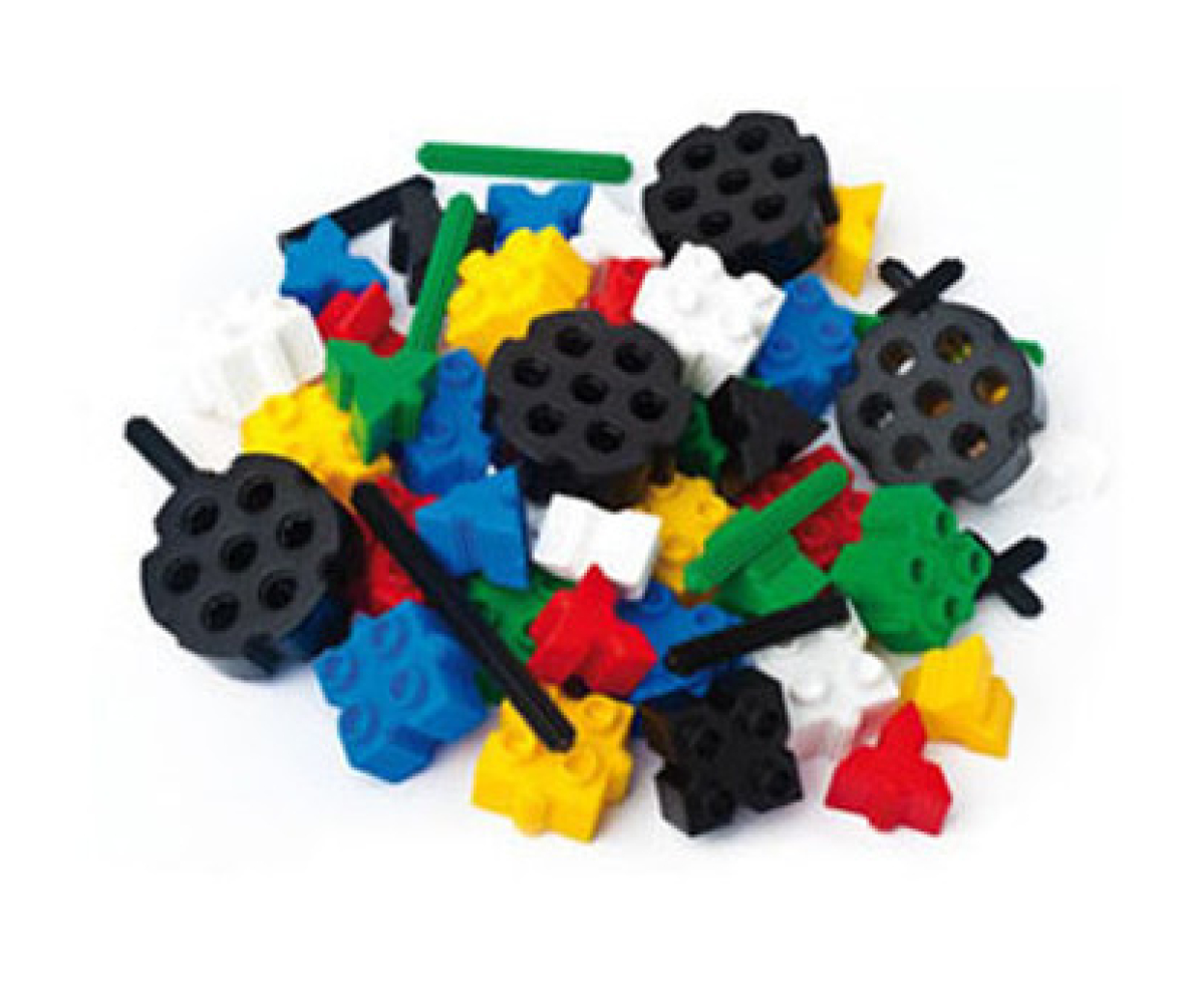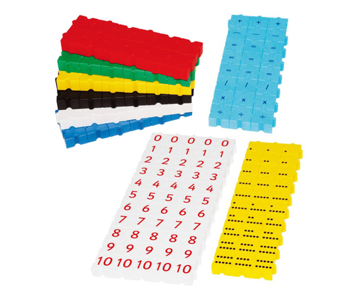 На деталі конструктора нанесені крапки від 1 до 10, цифри від 1 до 10 та математичні знаки. Картки - інструкції демонструють приклади рахунку від 1 до 10 на пальчиках, по крапках, а потім з цифрами. Числовий ряд можна утворювати як по висоті так і по довжині (на площині).