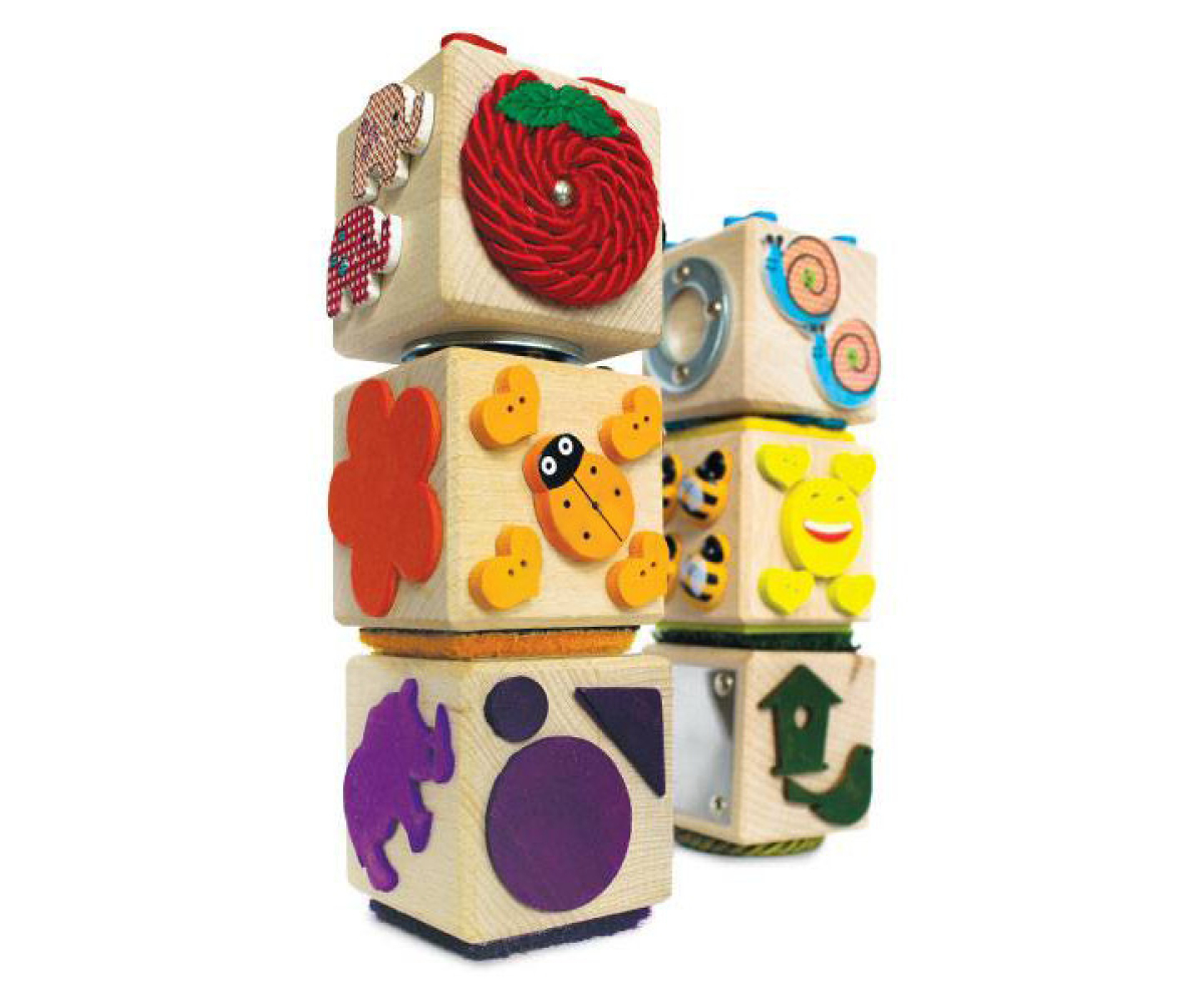 Сенсорні блоки виготовлені з якісної деревини. Вони мають прикріплені до сторін різноманітні екземпляри матеріалів різними за своїми властивостями: гума, фетр, деревина, хутро, метал, губка тощо, які дають різні відчуття фактури, текстури, кольору та температури.
