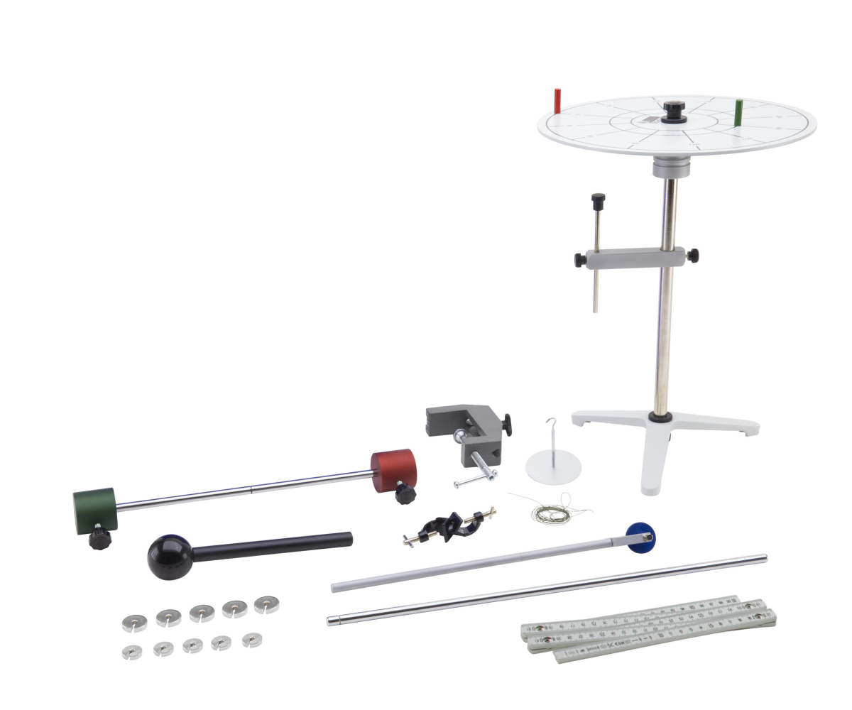 Орієнтовний склад набору: секундомір електронний з фотодатчиками з фіксацією часу та кількості обертів; змінні тягарці різної маси; обертальне колесо; обертальна балка зі шкалою; пружина; нерухома металева опора; покажчик зміни динаміки обертального руху; монтажні пристосування тощо. Комплектність набору повніша забезпечувати виконання експериментів відповідно до освітніх потреб; її визначає педагогічний працівник