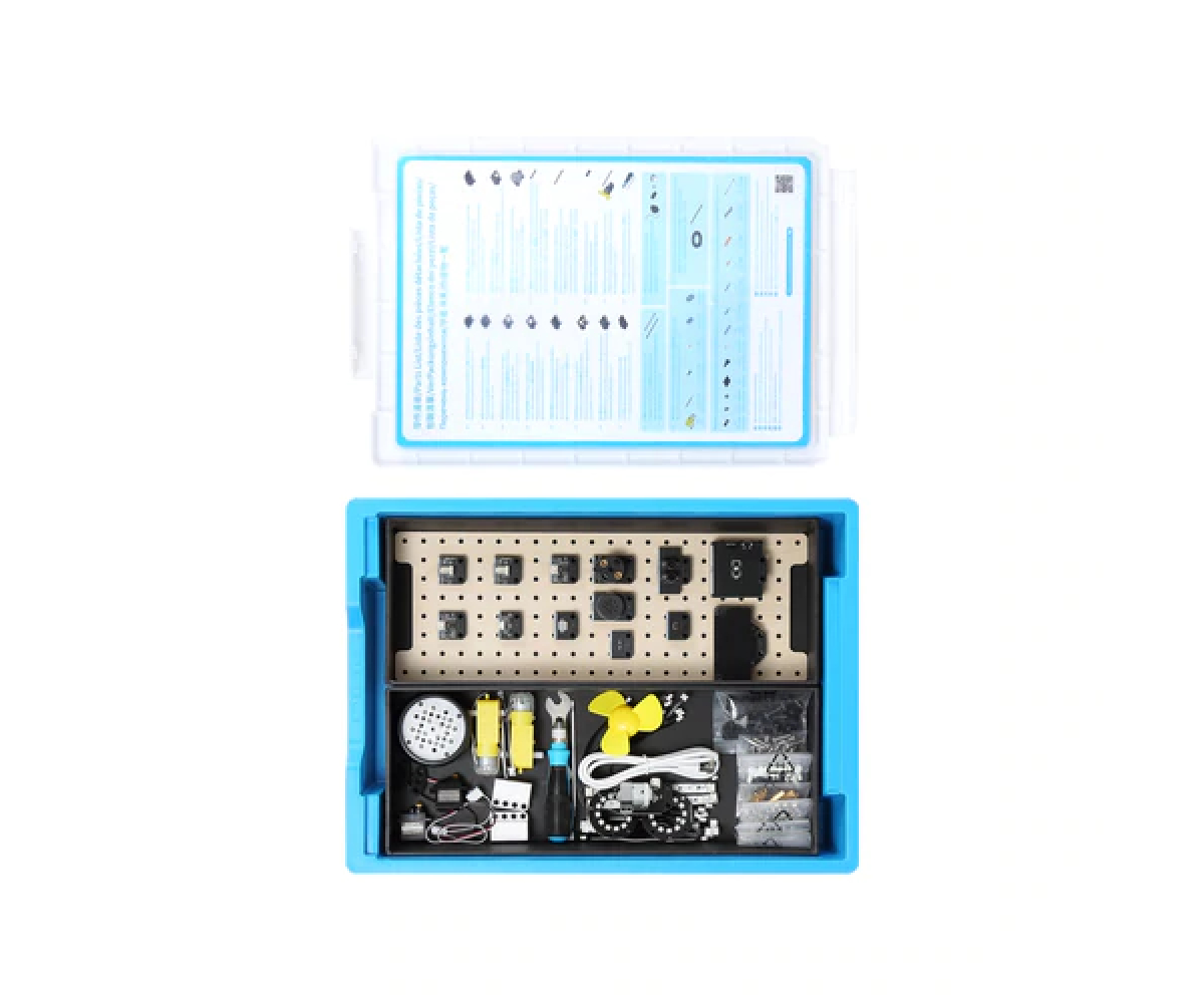 Комплектація: Micro-USB кабель; 1 × Викрутка; 1 × Світлодіодна матриця; 1 x Динамік; 1 x Модуль живлення; 2 x Драйвер мотора; 1 x LED драйвер ;1 x Блок розширення; 2 x LED кільце; 4 x Латунна шпилька М4х32; 4 x Велика заклепка; 2 x Серво драйвер; 1 x Подвійний RGB датчик кольору; 1 x Кутовий датчик; 2 x Серво; 2 х Мотор; 1 × Датчик дальності; 1 × ІЧ-датчик; 2 × Світлодіодна стрічка; 12 × M3 * 14 хрестовий гвинт; 1 × Набір з вентилятором; 8 × M3 * 20 хрестовий гвинт; 1 × M5 M7 двосторонній ключ; 5 х з'єднувальний кабель 5 В (10 см); 10 х з'єднувальний кабель 5 В (20 см); 35 × M4 адаптер; 20 × M4 * 14 гвинт; 20 × гайка М4; 10 × M4 контргайка; 20 × M3 * 12 латунний цвяшок; 1 × Наждачний папір; 8 × R4100 Заклепка; 30 × гумове кільце.