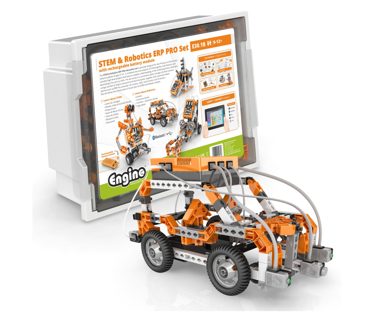 Набір поєднує основні STEM-дисципліни з робототехнікою та включає складні проєкти для глибшого розуміння теорії і розвитку навичок XXI століття. Набір міститься у зручній пластиковій коробці та включає багато конструктивних і технічних деталей, а також розширені робототехнічні пристрої: контролер ERP Pro, двигуни, світлодіоди, сенсор дотику та інфрачервоні датчики. За допомогою набору можна створити понад 30 моделей у сфері STEM та робототехніки.