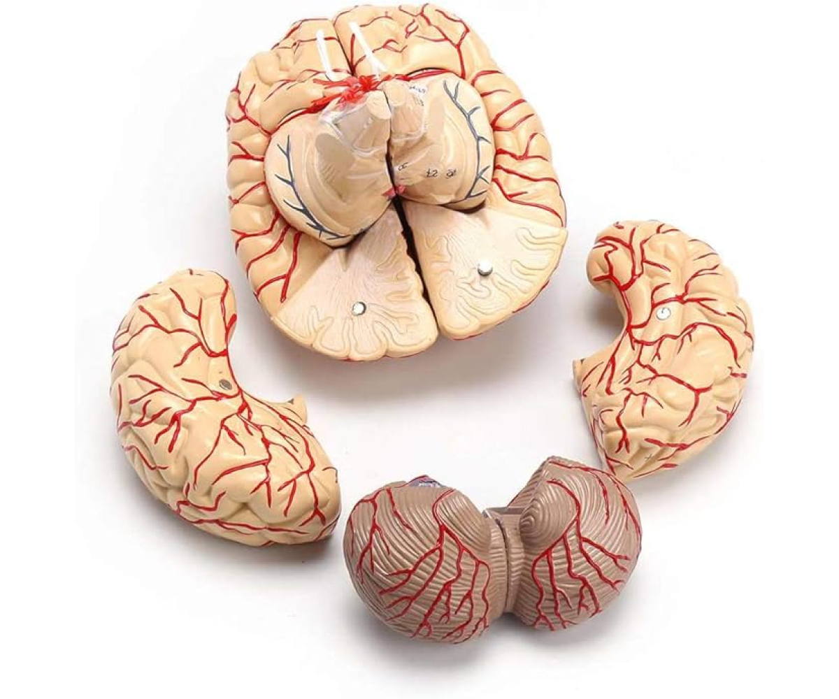 Модель демонструє зовнішню та внутрішню будову мозку людини, основні артерії, модель є розбірною з зображеними артеріями.