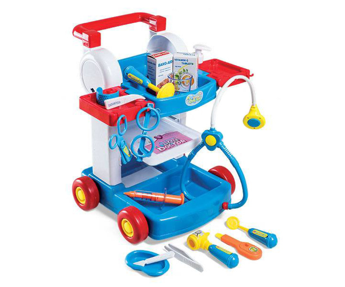 Комплект малого лікаря містить всі необхідні прилади для праці в лікарні. Комплект розміщується на візку, який легко пересувається і підходить для будинкових візитів. Звукові елементи чи можливість наливання води в контейнер, що знаходиться за візком урізноманітнять ігри. Кольори інструментів та візка: небесний, білий, жовтий, червоний.