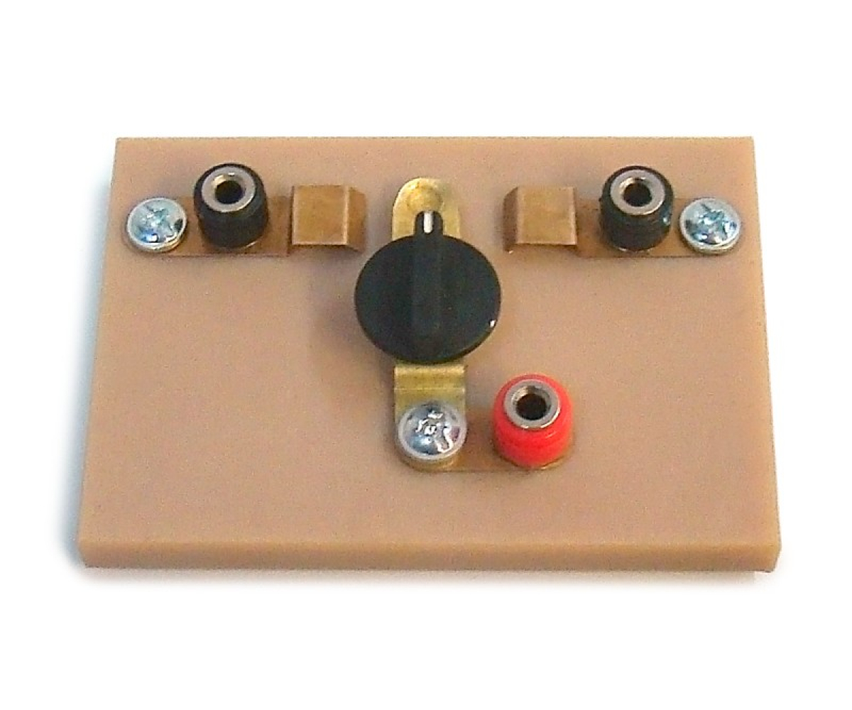 Використовується перемикач однополюсний в кабінеті фізики загальноосвітнього навчального закладу. Прилад призначений для замикання і розмикання електричних ланцюгів під час проведення лабораторних дослідів з електродинаміки. Прилад має пластмасову підставку, на якій встановлений ніж з рукояткою, пружні губки і універсальні затискачі для монтування електричної схеми. Допустима напруга до 24 В зі струмом навантаження до 2 А.