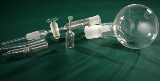 • Прилад для отримання речовин у твердому вигляді використовують для демонстрації процесу здобуття розчинних речовин в твердому стані з газів та концентрованих рідин у замкнутій системі поглинання. Крім того, він може бути використаний для демонстрації протитечії при вивченні технології хімічних виробництв, а також для отримання твердих амонійних солей, таких як азотні, фосфорні, сірчані та інші кислоти, при вивченні аміаку та мінеральних добрив.