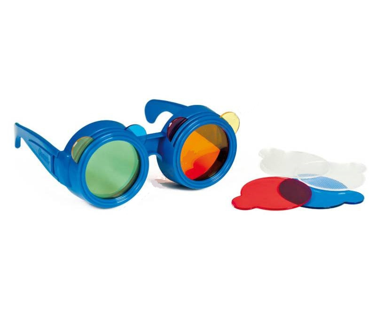 Окуляри зі змінними лінзами. Можна помістити дві лінзи в одну оправу, щоб дитина могла порівнювати та змішувати кольори. До складу комплекту також входить викривлене скло, яке дає ефект зображення, побаченого крізь око комахи.