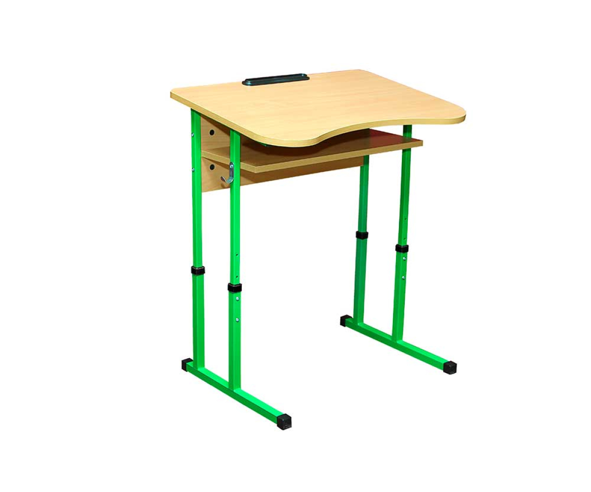 Металеві частини стола учнівського виготовлені з квадратної труби 25х25х1,2 мм і 20х20х1,2 мм та мають захисне декоративне покриття – емаль порошкова. Регулювання висоти столу здійснюється за допомогою гвинтів по отворах каркасу і ніжки, між якими встановлена пластикова перехідна втулка. На торцях каркасу закріплені пластикові наконечники, які запобігають травмуванню учнів та пошкодженню підлоги. Стільниця антисколіозна з кутом нахилу 7 градусів та із заокругленими кутами, виготовлена із ДСП ламінованої 18 мм, ПВХ – 1 мм, екран та полиця – з ДСП ламінованої 16 мм.