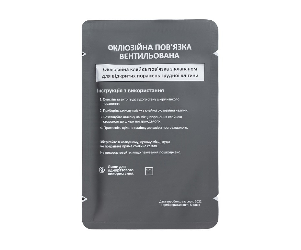 Вентильована оклюзійна пов'язка поставляється в ультра компактному пакуванні і швидко розгортається, при цьому, в складеному вигляді не перегинається і не втрачає своїх властивостей.