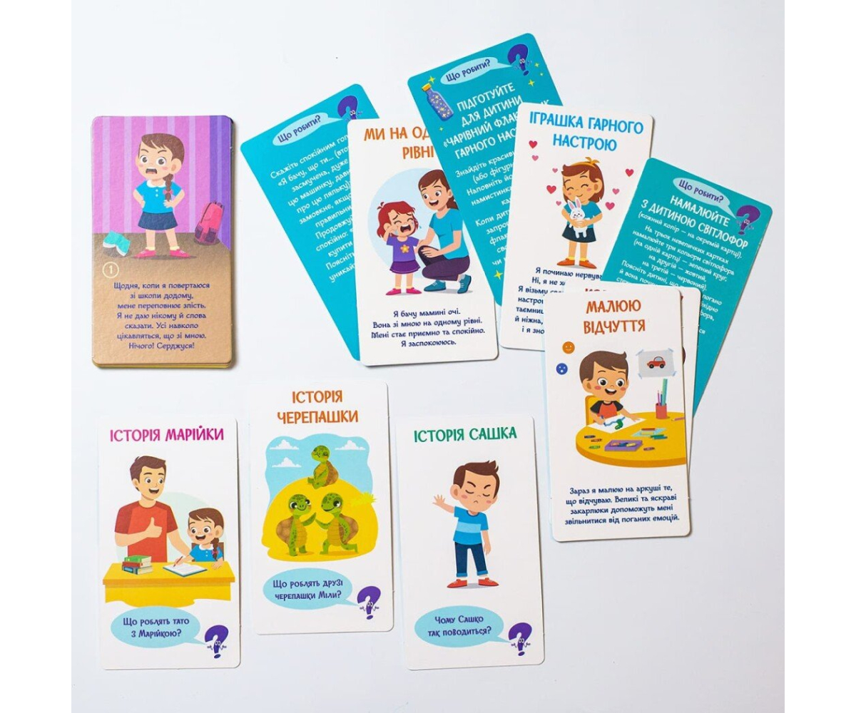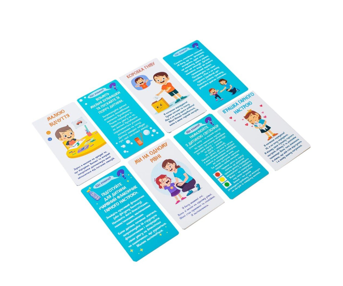 Картки, що входять до гри, пропонують веселі й цікаві вправи, які допоможуть вашій дитині керувати своїми негативними емоціями. Дитина, яка намагається контролювати себе та прислуховується до батьків, швидше їх подолає.