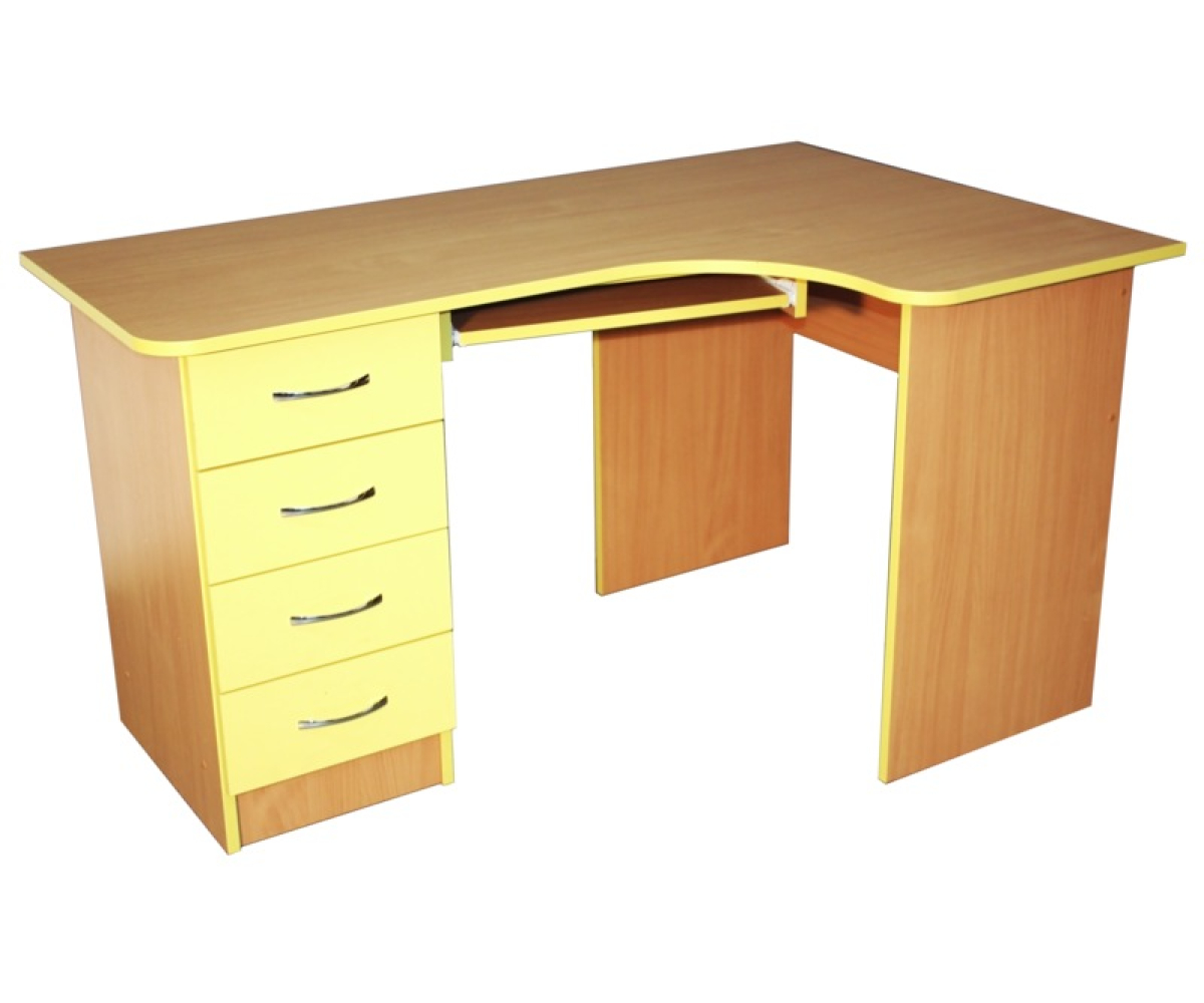 Стіл комп'ютерний кутовий однотумбовий, обладнаний виїзною панеллю для клавіатури та тумбою з 4 шухлядами.