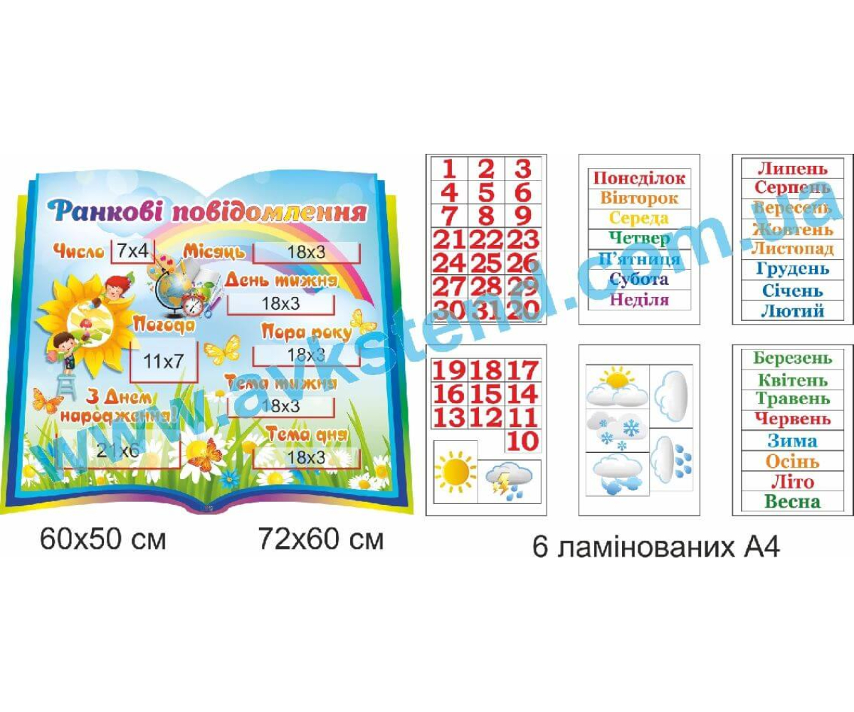 Ранкові повідомлення – 60х50 см, 1 кишенька 7х4 см, 1 кишенька 11х7 см, 1 кишенька 21х6 см, 5 кишеньок 18х3 см