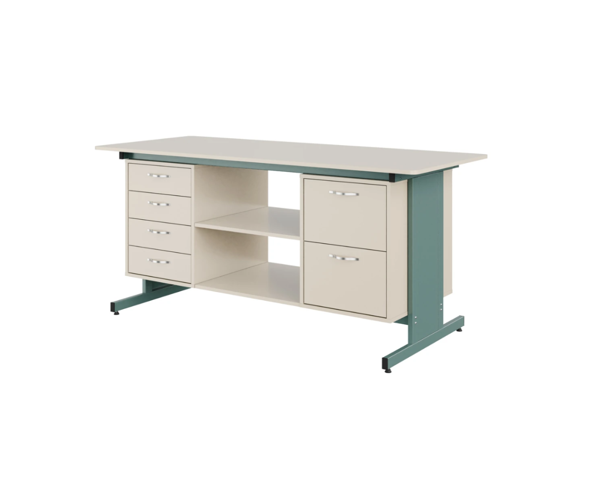Стіл укомплектований 6 шухлядами: 2 шухляди з фасадами висотою 294 мм, 4 шухляди з фасадами висотою 146 мм. Шухляди встановлені на телескопічних направляючих повного висування, довжина — 500 мм. Передбачено дві відкриті ніші.