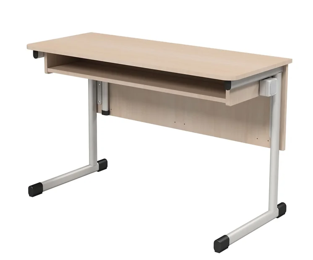Деревинні деталі стола виготовляються з ламінованої ДСП товщиною 18 мм. Стільниця оклеюється крайковою стрічкою ПВХ товщиною 1 мм, інші елементи оклеюються крайковою стрічкою ПВХ товщиною 0,5 мм. Металеві частини стола виготовляються з плоскоовальних труб розміром 50х30х1,2 мм, 30х15х1,2 мм та 38х20х1,2 мм, а також мають захисне декоративне покриття – емаль порошкова. На торцях каркасу закріплені пластикові наконечники, які запобігають травмуванню учнів та пошкодженню підлоги. Стіл оснащений двома розетками та кронштейном для підводу електричних дротів. Кронштейн можливо установити в шістьох положеннях – лівій, правій або середній частині екрана, а також у верхньому або нижньому положенні.