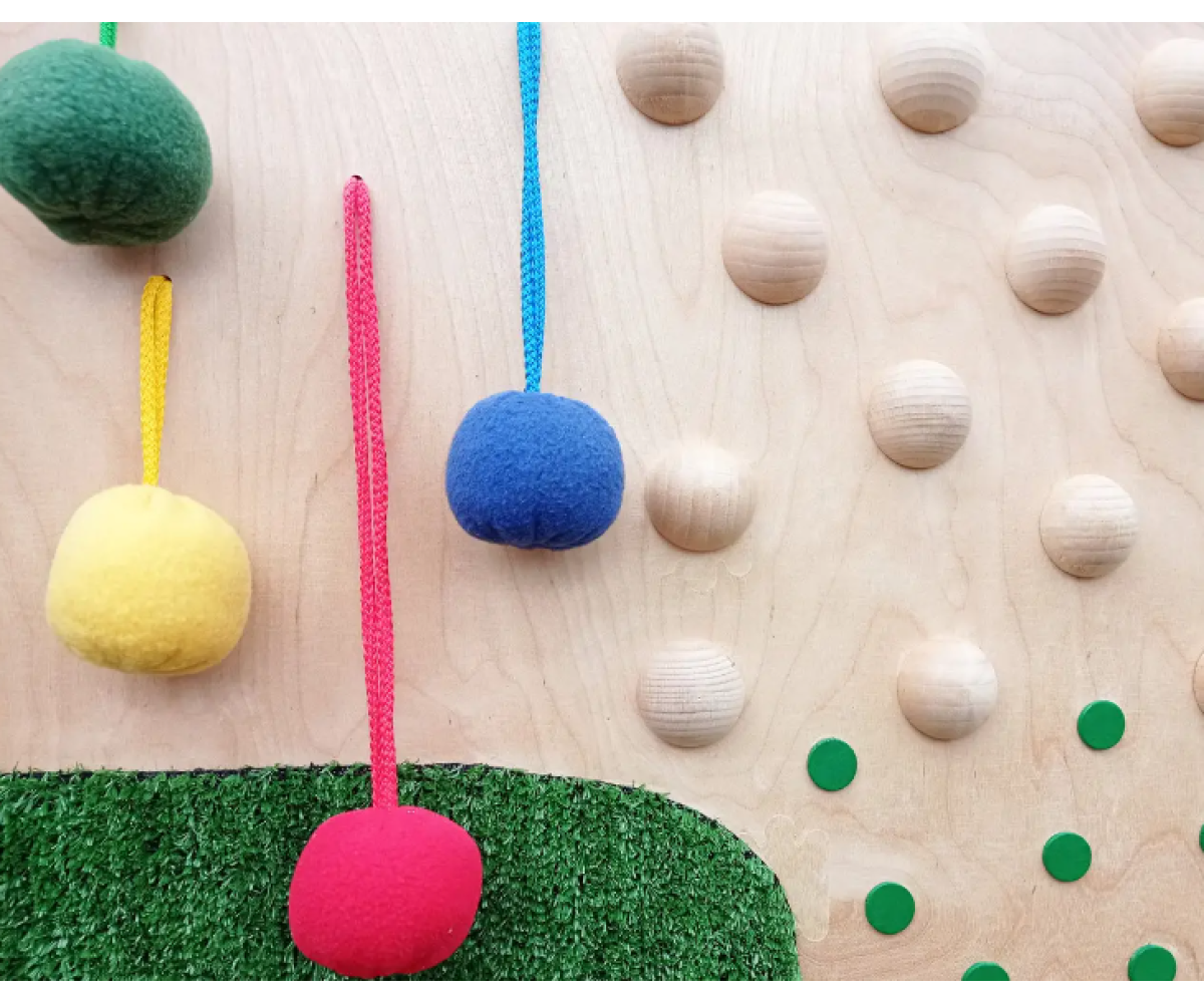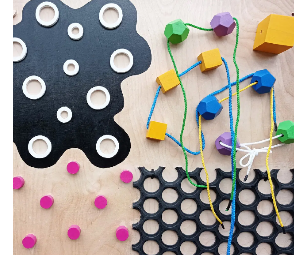 Тактильна панель об’єднує теми: різні тактильні поверхні, різні матеріали, різні форми, кольори, об’ємні та плоскі геометричні фігури, шнурування та навіть звукові елементи.