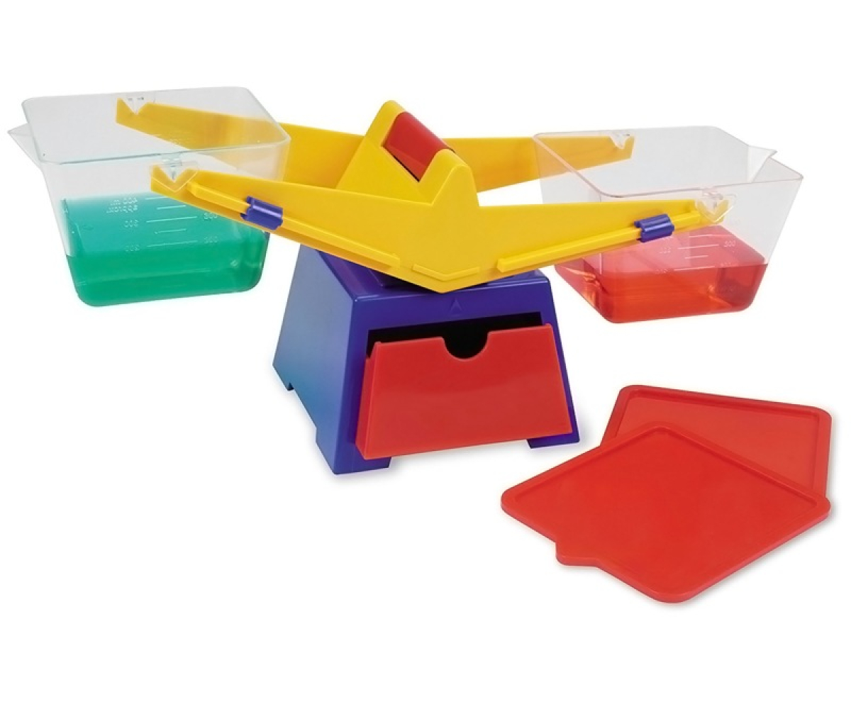 Терези застосовуються для дослідів з об’ємом і порівнянь твердих речовини та рідини. Калібровані, прозорі ємності (відерця) зі кришками, що знімаються, вміщують тверді речовини або до 400 мл рідини.