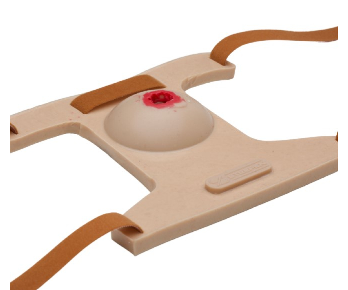 Тренажер призначений для симуляції вузлової кровотечі та відпрацювання навички зупинки вузлової кровотечі методом тампонування і прямого тиску на рану у ділянках, де неможливо накласти турнікет (пахвинна та підпахвова ділянки). Тренажер сконструйований таким чином, що можна його розмістити в пахвинній та підпахвовій ділянках тіла і міцно зафіксувати стрічками-липучками. Високоеластичний силікон імітує мʼякі тканини з ураженням при кульовому пораненні. Глибина ранового каналу 3 см з імітацією руйнування тканин в глибині рани. Комплектується конектором для подачі штучної крові з пробкою для ПЕТ пляшки. Міцний і довговічний, легко миється під проточною водою.