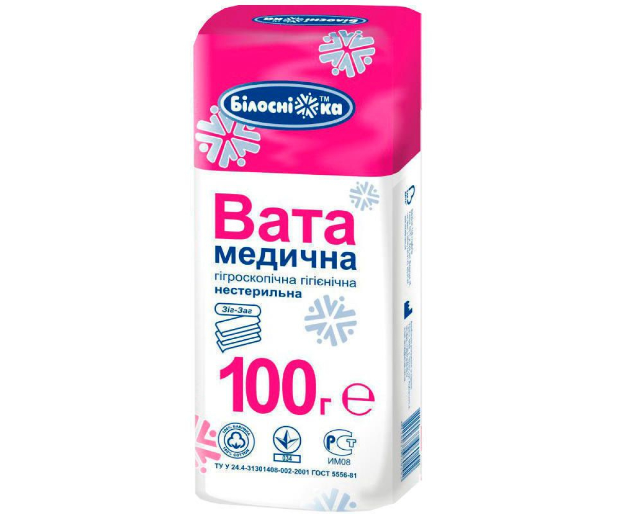 Вата гігроскопічна нестерильна виготовлена зі 100% бавовни високої якості, вибіленої без використання хлору.
