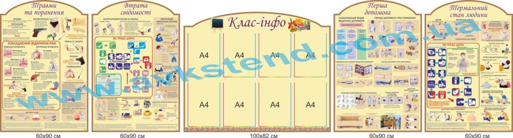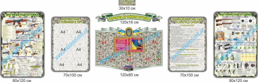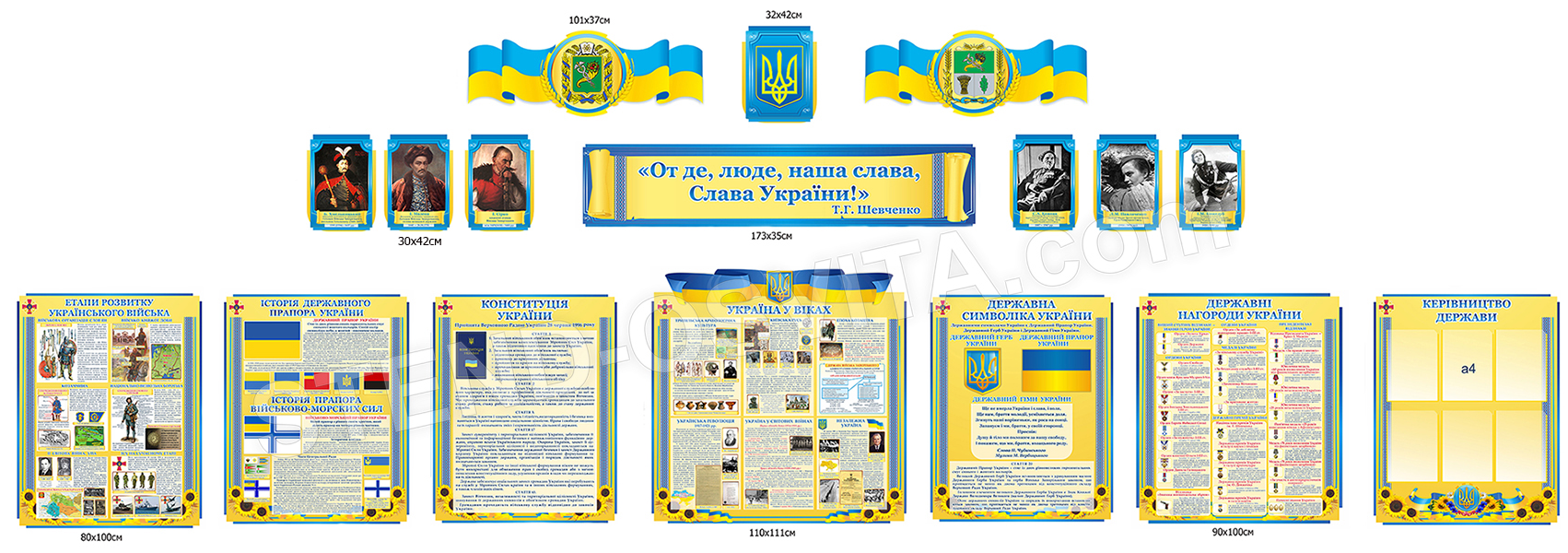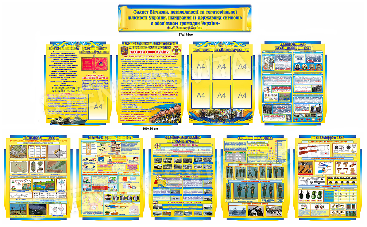 Стенди в кабінеті Захист України – важливі елементи, які одночасно виконують декілька функцій, допомагають підвищити ефективність засвоєння учнями нових знань. Роблять подачу інформації наочною та доступною. На них у компактній формі розміщені навчальні матеріали та символіка. Яскраві фарби, цікавий дизайн привертають увагу учнів. Навчальна інформація представлена ​​у структурованому вигляді, це допомагає краще засвоїти новий матеріал. Стенди виготовляються з урахуванням сучасних вимог. Поверхня захищена від механічних пошкоджень, а фарби від вицвітання. Вироби відповідають стандартам безпеки та якості.
