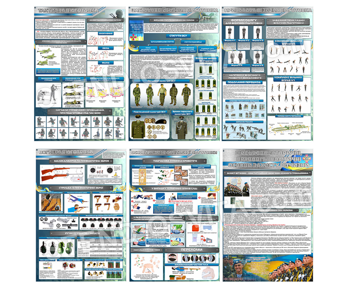 • Навчальні. Допомагають вивчати військову справу та безпеку. Містять схеми та таблиці, які знайомлять учнів із основами військової підготовки, першої медичної допомоги, тактичними діями у надзвичайних ситуаціях.