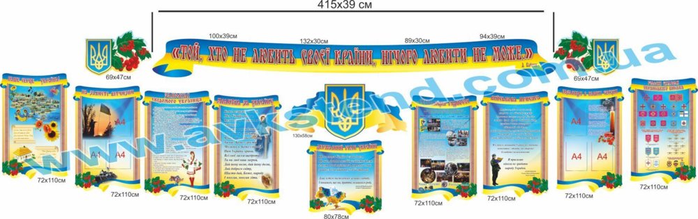 • Символіка України. Розповідають про національні символи та традиції. На них зображені державні символи, текст гімну та коротке пояснення їхнього значення. Також вони містять інформацію про важливі для української держави історичні дати, традиції та культурні особливості.